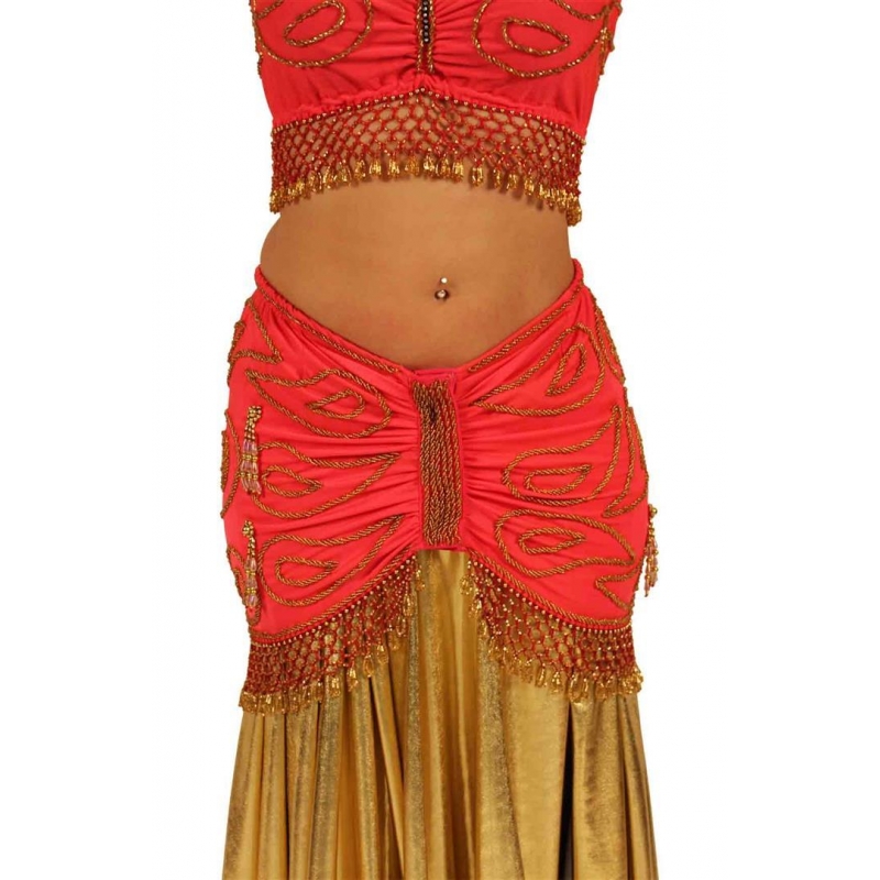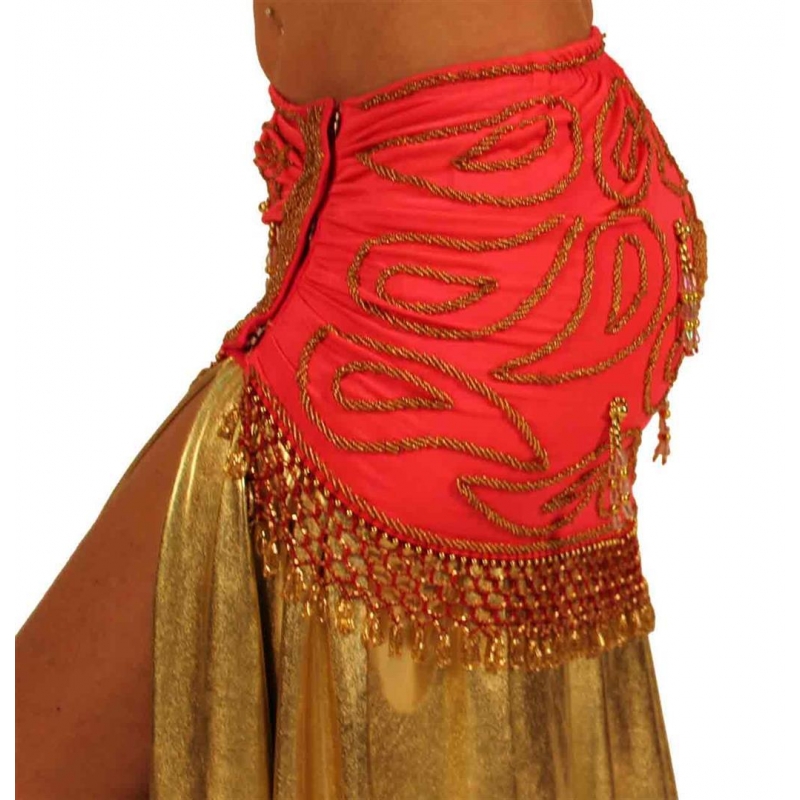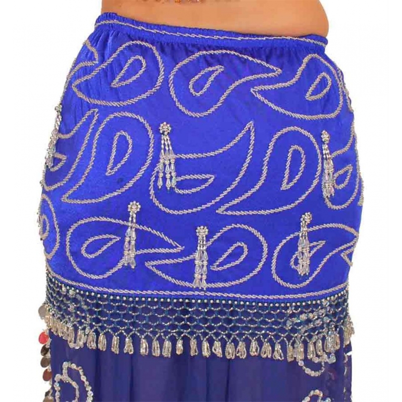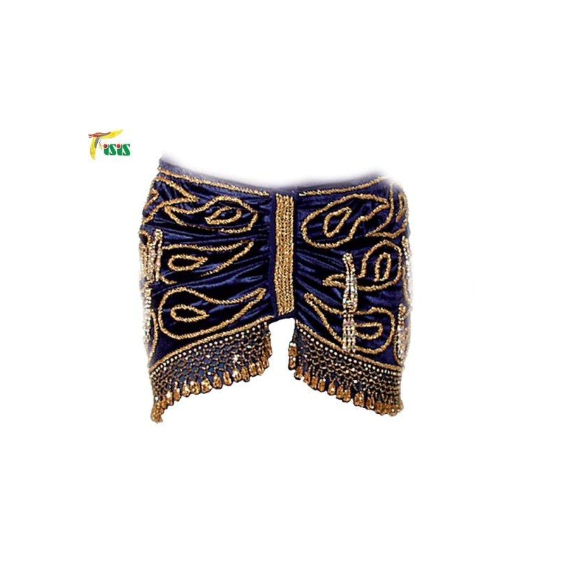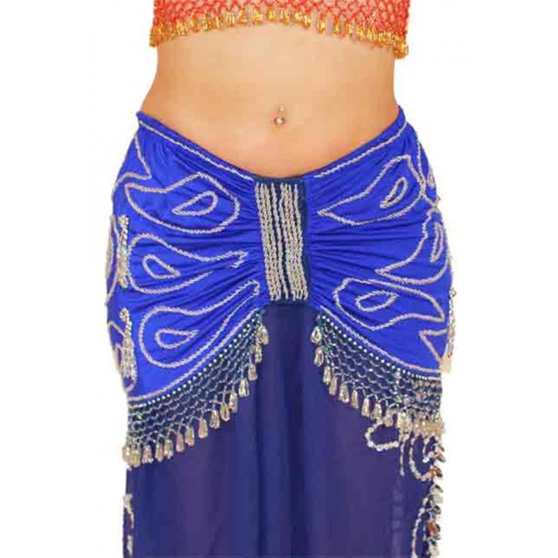 Hüfttuch aus Stretchsamt oder Lycra. Bestickt mit Glasperlen und Tropfen. Verschließbar mit drei Haken. Die Häkelborte ist mit Glasperlen bestickt.