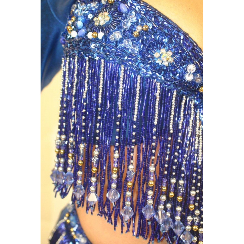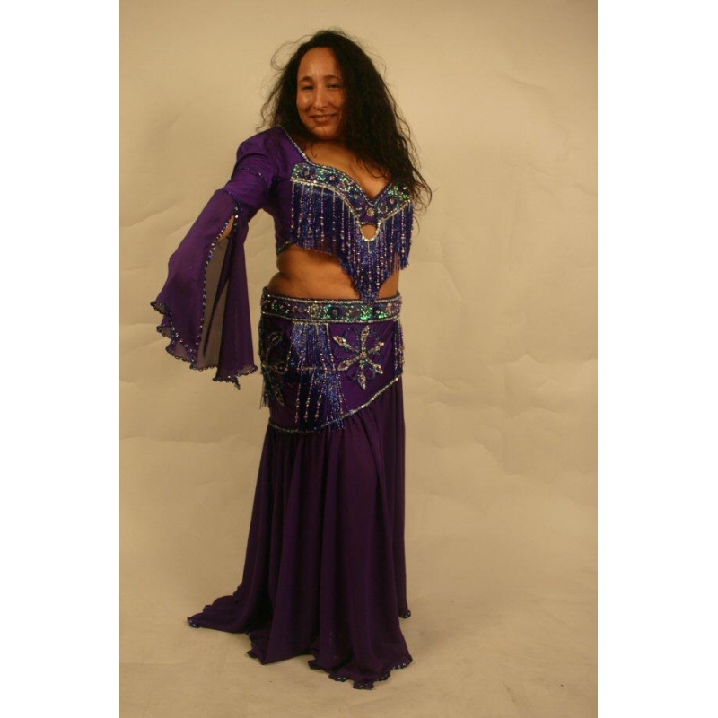 Bauchtanzkostüm aus Stretchsamt / Lycra und Georgette-Chiffon für die Ärmel, den unteren Teil des Rockes und den Schleier. Bearbeitet mit Perlen, Pailletten, Glaskugeln und Swarovski-Steinen