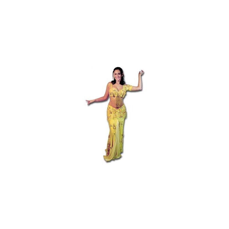 Oberteil mit Spaghetti-Träger und Halbarm bzw. Langarm; Rock enggeschnitten bis zum Knie, unten sehr weiter Schnitt. Hoher Schlitz gefüllt mit Georgette-Chiffon. Halbrunder oder viereckiger Schleier aus dem gleichen Chiffon.