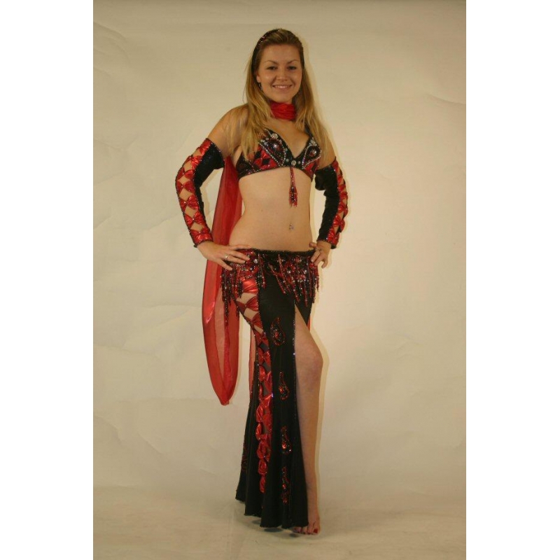 Zweifarbiges Bauchtanzkostüm mit Armstulpen aus Lycra aufwändig bestickt mit Perlen und Pailletten und Svarowski-Steinen