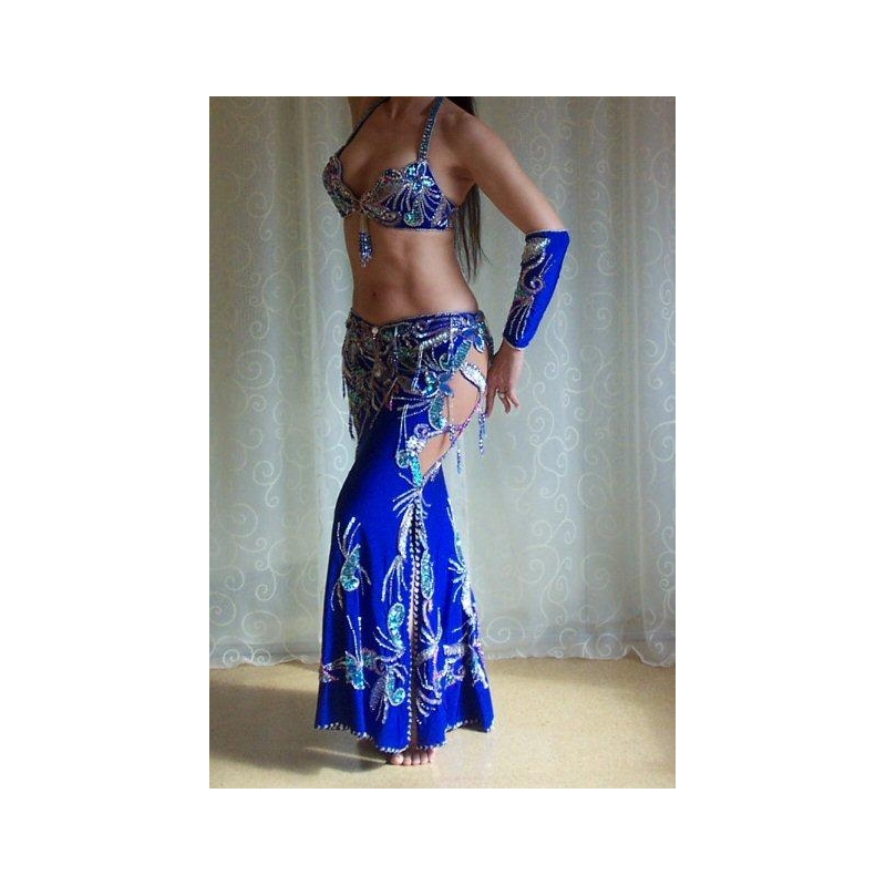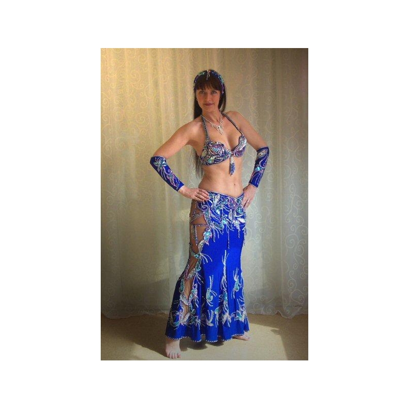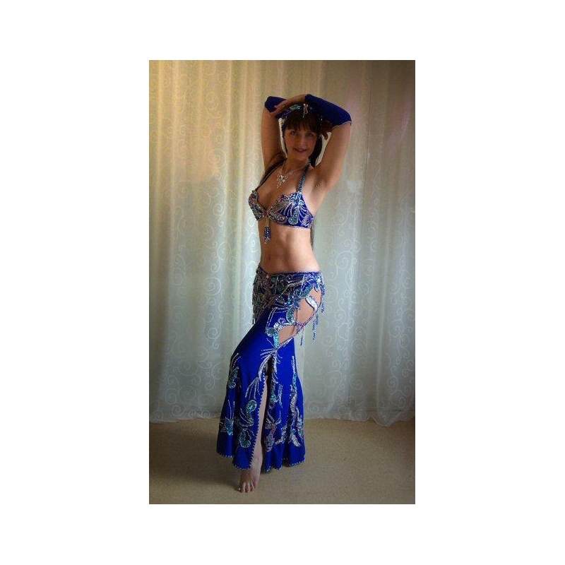 Bauchtanz-Kostüm mit Netzeinsatz am Oberschenkel. Es st aufwändig bestickt mit Perlen und Pailletten und Swarovskisteinen. Das Kostüm ist wählbar in Lycra oder Stretchsamt. Der Netzeinsatz ist möglich in hautfarbenem Netz oder Ton in Ton.