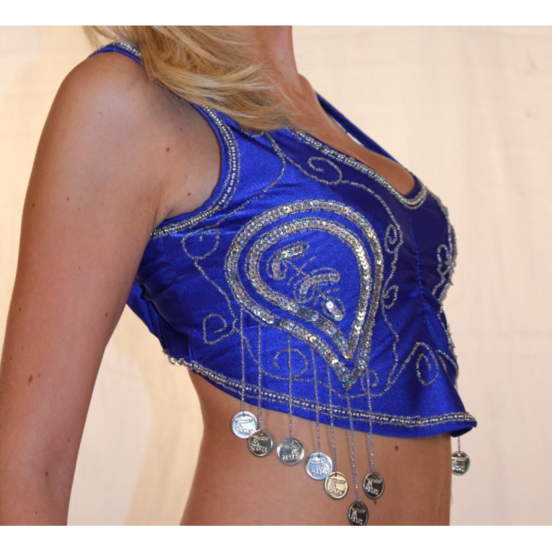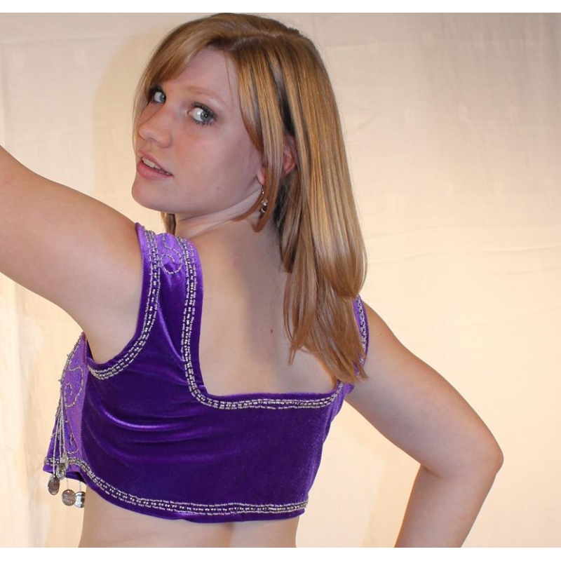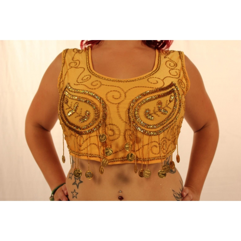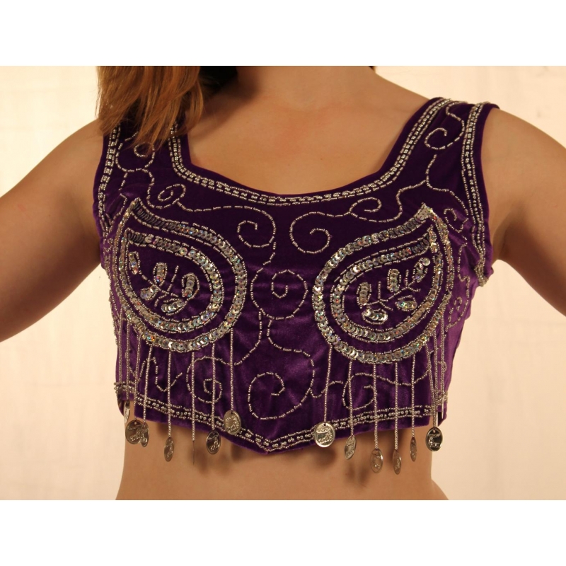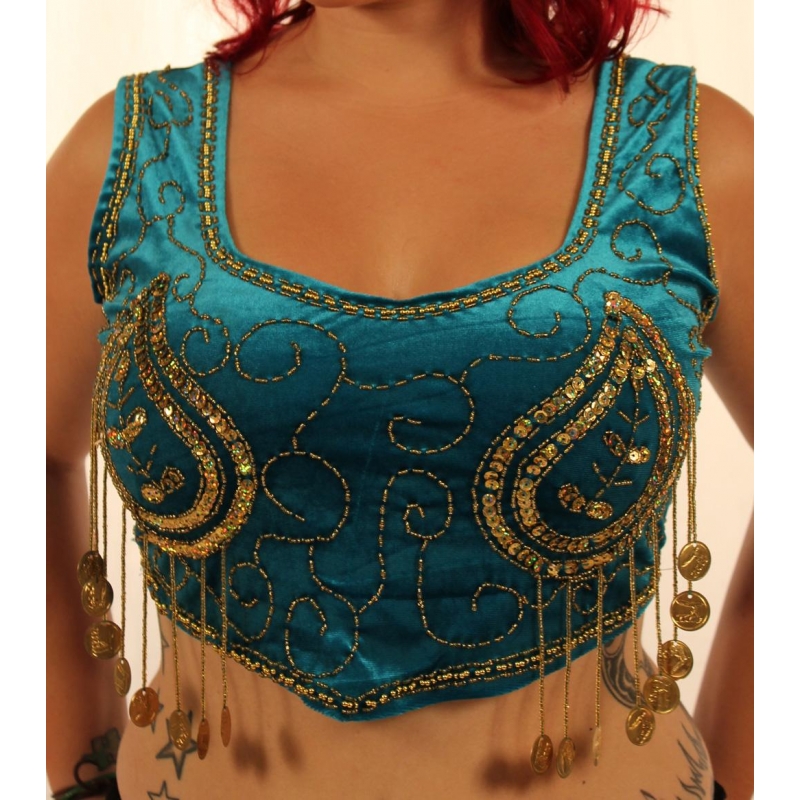 Ärmelloses Oberteil mit Münzfäden aus Messingmünzen aus Stretchsamt oder Lycra.